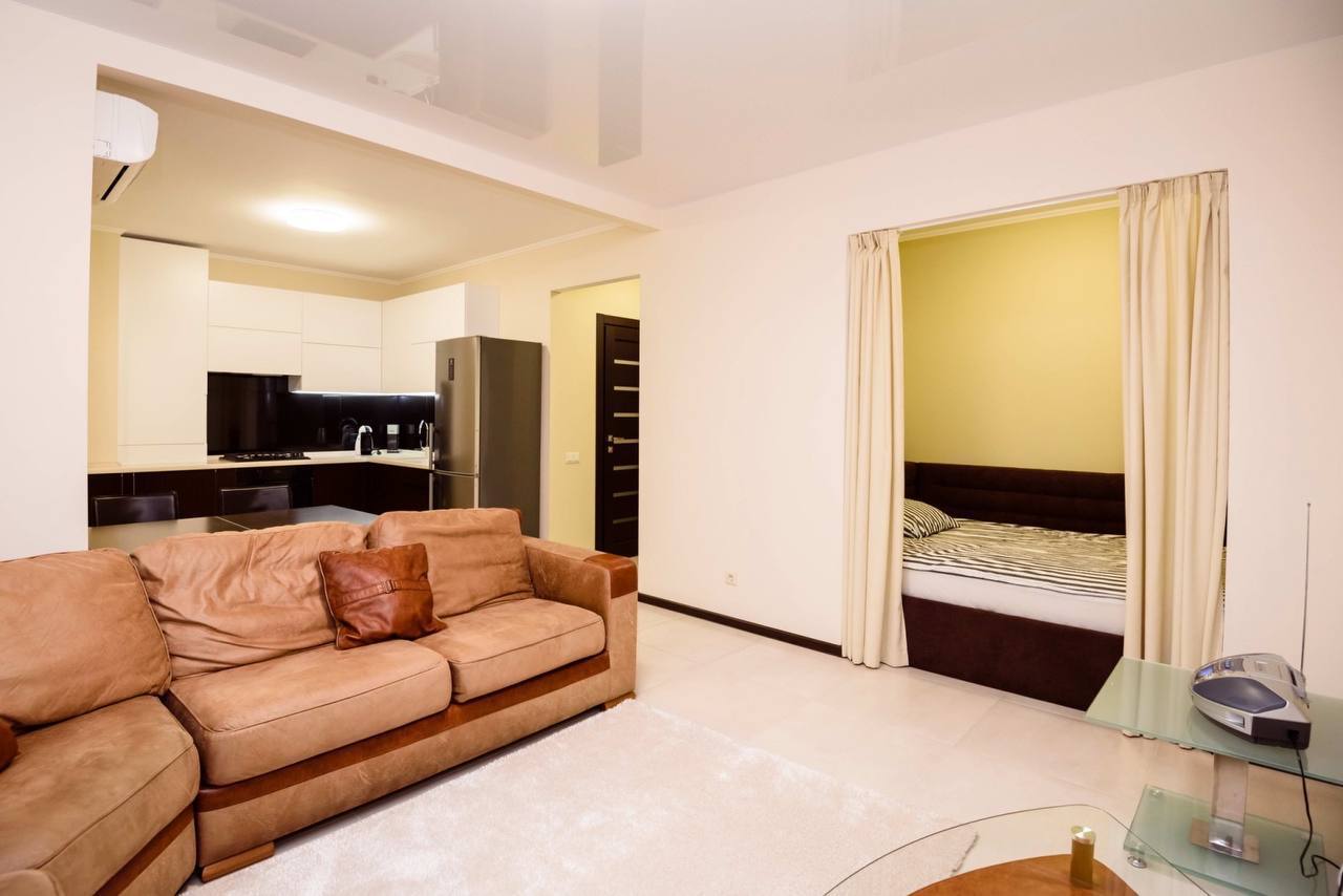 Планировка: кухня-студия с диваном и кровать в нише.