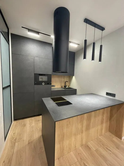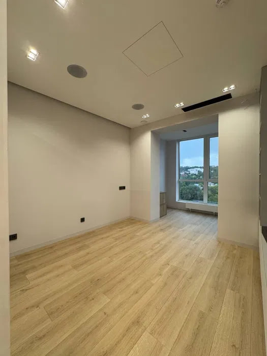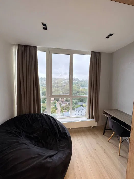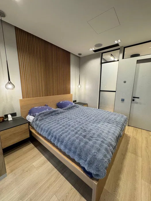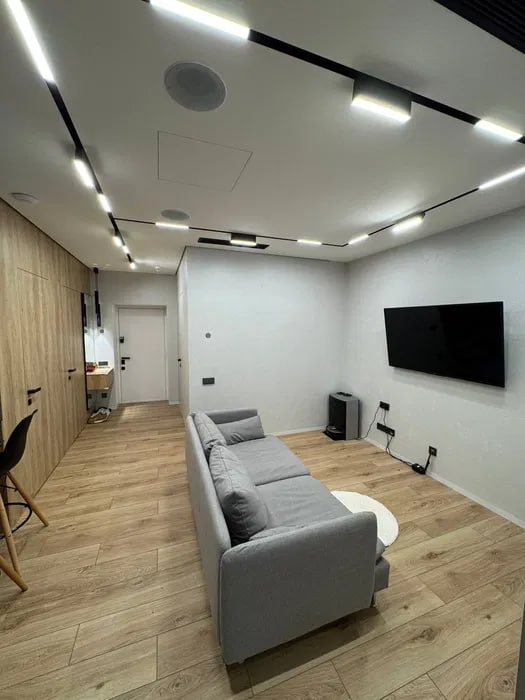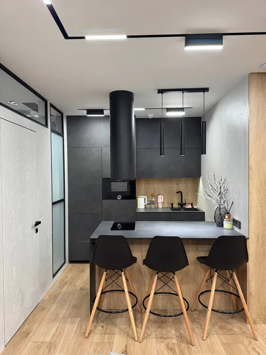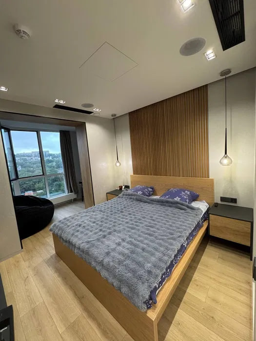 Планировка: кухня-студия, спальня, кабинет, гардеробная, с/у.